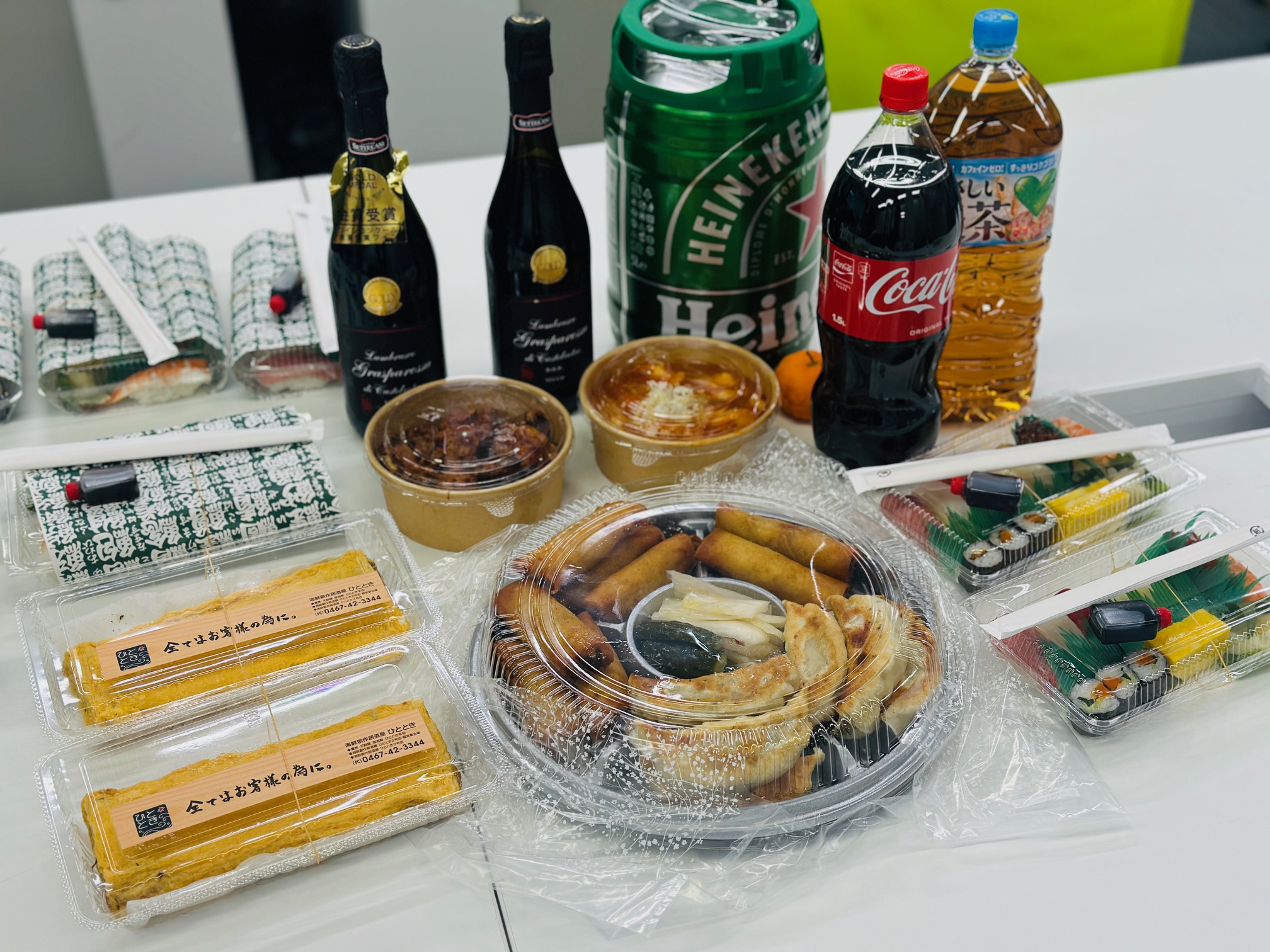 本日、午前中で2025年の営業を無事に終え、午後からは社内で納会を開きました。 テーブルにはお取引先の寿司や卵焼き、餃子、春巻きなどのオードブル、ワインやビール…